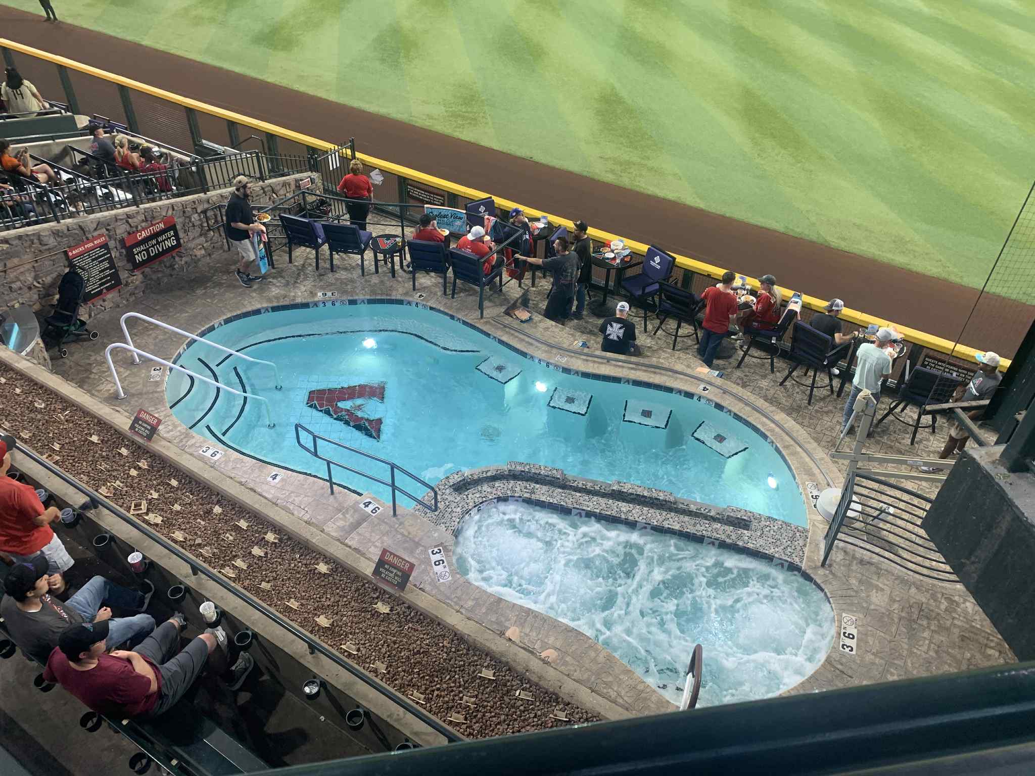 Chase Field's lower concourse is an average-looking one -- non-branded food stands, merchandise in various spots, good views of the field in standing room sections. There are a few unique elements, however: there is a publicly accessible gym, with machines and weights, which I thought was pretty funny to look at. Within right field there is the crown jewel of Chase Field: the pool, which is visible from the concourse as well. When we looked, nobody was swimming in it, and I don't believe anyone stepped foot in it for the duration of the game. It's a cool thing to have at a ballpark, and created quite a memorable moment when the Diamondbacks used the power of friendship to will themselves to a 2023 NLCS championship and celebrated within the water, but I do wonder how much it actually gets used. Thanks to my holding of a Chase debit card from when I turned 14, I was able to get 25% off at the "Taste of Chase" stand, where Mark and I split a Soarian Dog and garlic parmesan fries. Both were tasty and quite affordable with the discount!