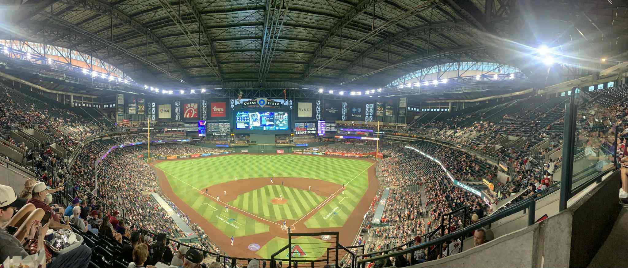 My stadium chase stalled in 2025 -- I originally had planned to hit Atlanta, Tampa, and Miami in one road trip through the southeast, and then fly to Arizona and Seattle separately. However, because of the damage caused to Tropicana Field caused by Hurricane Harvey which booted the Rays to a minor league stadium, I had decided to put most of my plans on hold until the repairs were complete (my fingers are crossed the April 2026 estimate holds). I still managed to find time to fly to Phoenix, though, visiting an old friend from high school, Mark, in the process. With 115 degree heat, walking in the city felt like wearing a heated blanket I couldn't take off. Due to this regular scorching heat, Chase Field is a domed stadium. I've talked about domes in the past when I've visited them -- it feels like there is more pressure within the stadium and it is an "exciting" watch compared to open-air stadiums. Both have their pros and cons, but the dome echoing sound and allowing for isolated lighting make it feel like every pitch is that much more important, especially within a tight game.