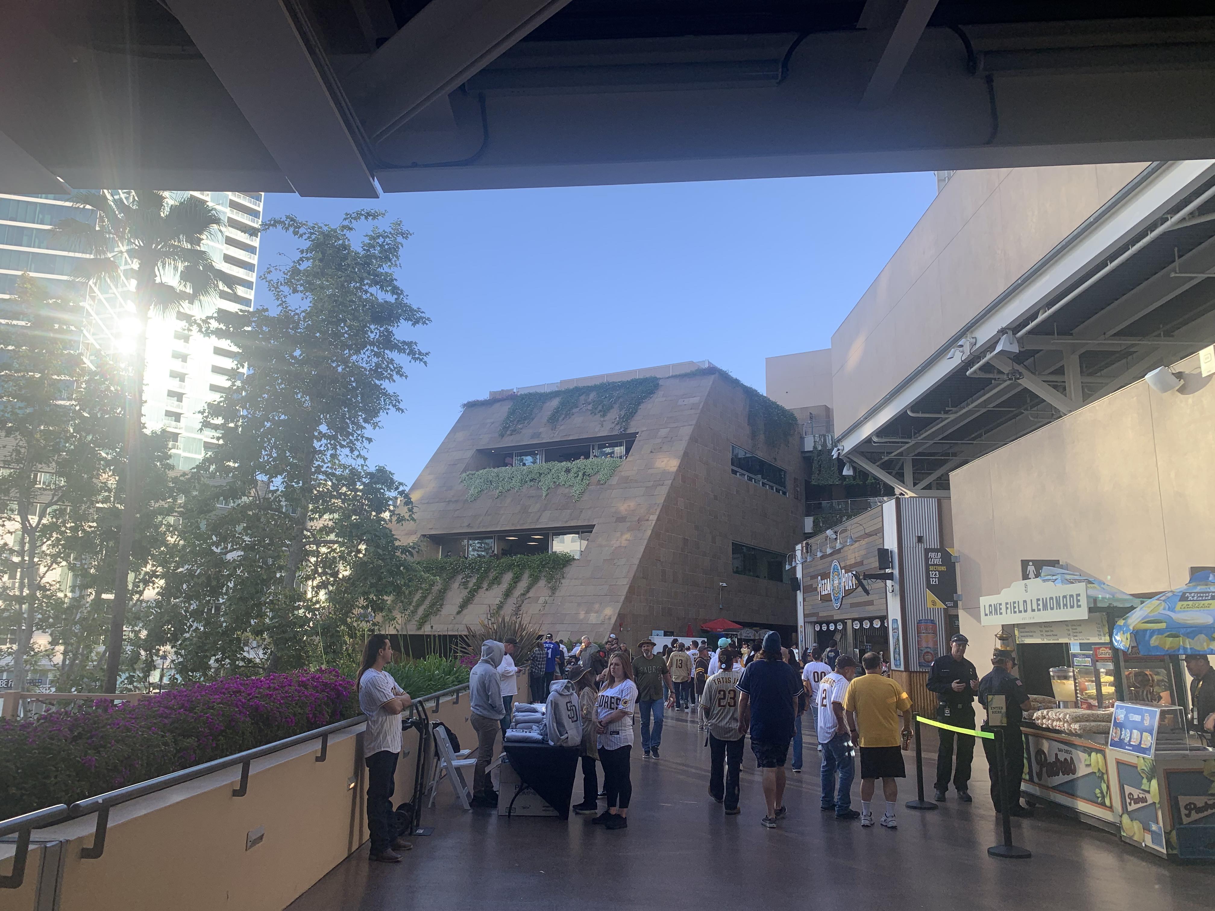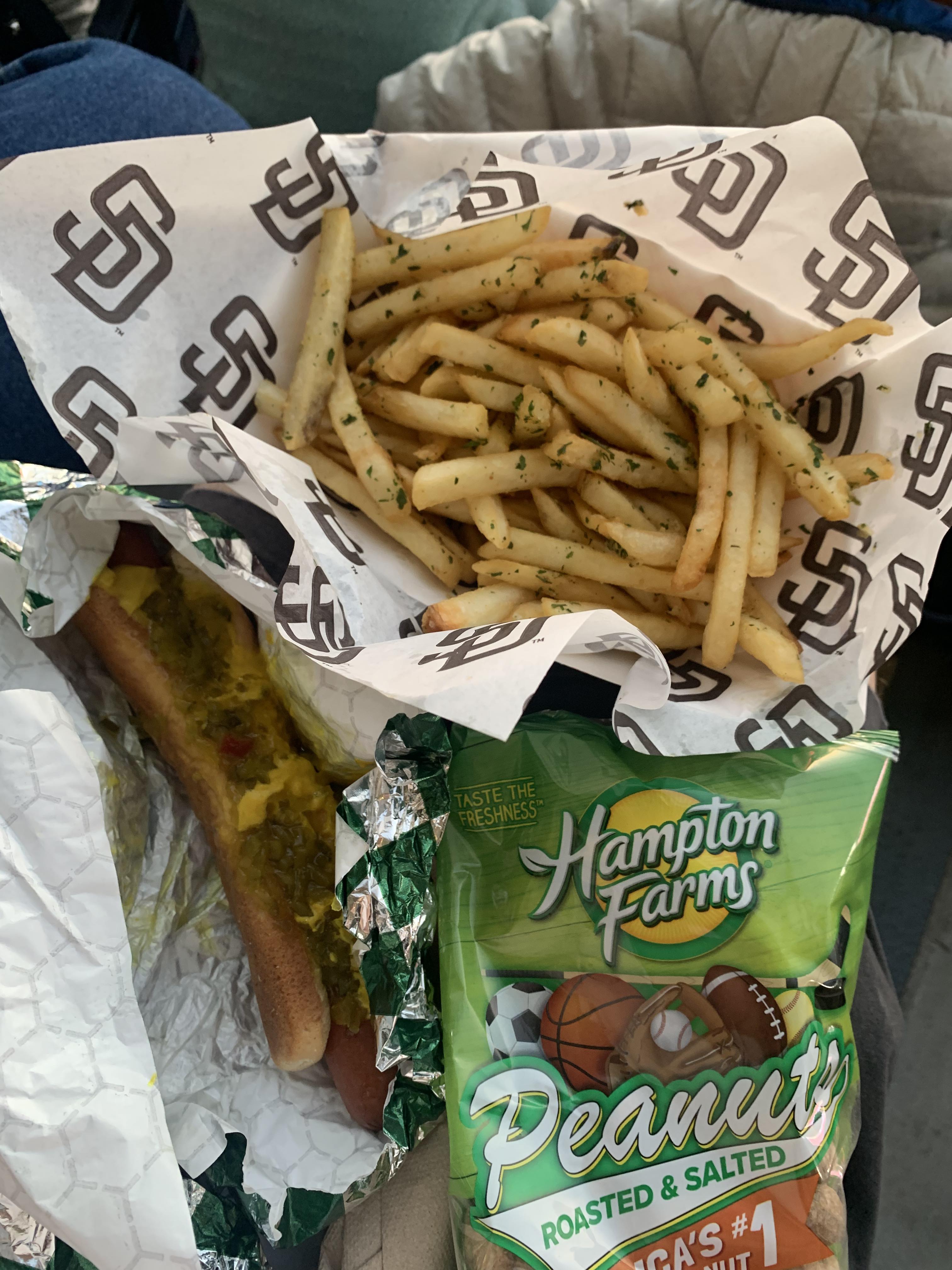 Once we'd stepped foot through the gates, I was blown away by how expansive the park was. It felt bigger than other stadiums I'd visited up to this point, with there being seemingly more to do -- especially with the newly constructed Gallagher Square. I did not plan this ahead of buying these tickets, but this particular Padres game was a "Bark in the Park" day. With this park being sponsored by Petco, they had plenty of dog-based amenities and we had walked past some adorable little guys as we headed towards our seats. I typically try to get seats in upper decks behind home plate, and I missed the mark a bit as we were a bit past first base. However, as a result of getting a nosebleed Lucas and I walked around nearly the entire stadium to get to our seats which is where my appreciation for Petco Park grew. The blend of tan paint used and the seemingly real plants and vines that hung from the rafters and gripped some of the walls made the park feel lush and welcoming. Once I left the concourse, I was greeted by a breathtaking backdrop of the San Diego skyline and a great view of the field. We claimed our seats and I moved back to get some food that wound up being decidedly average in terms of ballpark-specific food (which was the only weakness, if you could even call it that, of Petco). The garlic fries I bought hit the spot well, but I couldn't find anything amazing.