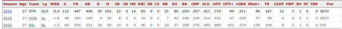 The most effective way to look at Andrew Vaughn's 2025 season in summary, in my opinion, lies on his Baseball Reference page. Below a few disappointing White Sox seasons, his stats for 2025 are split by team: 48 games for the White Sox, and 64 games for the Brewers.