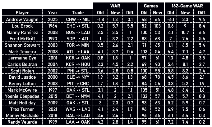 Vaughn's midseason turnaround with the bat is singular in the entire centuries-long history of baseball. If we use the same logic as we did earlier and extrapolate two separate 162-game seasons for each team, Vaughn's 9.4 WAR swing stands alone as the best single-season turnaround. In 2018, Bleacher Report released an article detailing the 20 best midseason acquisitions in MLB history. Taking the hitters from this list, adding it to the hitters from a list of the biggest midseason acquisitions published by MLB's Andrew Simon in 2025, and comparing both the extrapolated WAR totals and raw WAR totals tells an incredible story.