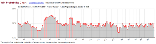 Game 3 was an instant classic, and a better game than Game 7 in terms of dramatics. This game went eighteen innings, meaning that there were two games of baseball within this single game of baseball which ties the longest World Series game in history. This game would have ended in nine if a baserunning gaff with Bo Bichette and Daulton Varsho didn't happen off of a controversial missed ball call. The pitching win went to the Dodgers' Will Klein, who saved his fellow pitchers' arms by pitching 4 innings of 1-hit ball between the 15th and 18th. There were a total of 19 people that threw pitches in this game. The Dodgers put a retiring Clayton Kershaw in a bases-loaded jam in the top of the 12th and Kershaw, a known playoff choker, got out of it with a groundout. Shohei Ohtani was intentionally walked four times in this game and finished going 4-4 with 3 RBI and two home runs. The last time four intentional bases on balls happened in any baseball game was Barry Bonds in 2004. The Win Probability chart for this game changes directions 55 times from the bottom of the eighth to the end of the game and looks like a city skyline. I passed out in the bottom of the 8th and woke up in the top of the 14th and then rewatched the game the next day.