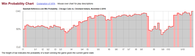Game 7 of the World Series is as tense as it gets, stakes-wise. In Game 7, the Cubs had an early lead and as high as a 95% chance to put the game away in the 8th. However, the famous Rajai Davis home run evened things up in the bottom of the eighth, swinging the win probability by as much as 40% by the end of the inning. This chart changes direction 14 times from the top of the eighth to the end of the game, including passing the 50% mark six times, with a few distinct drops and rises. These drops and rises can be measured via Win Probability Added -- the impact players make to this chart on each play they make, both positive and negative. This stat has a sibling called Championship Win Probability Added, which measures against the probability a team wins the World Series instead of just the game. However, in the do-or-die Game 7 of the World Series, these things are one in the same, which means that in these high-stakes games players have a more direct impact on their championship odds than any other game in the season. This game has two of the top 20 plays by cWPA since 1903: the Rajai Davis home run (6th), and the Ben Zobrist double in the top of the tenth inning (20th). It also had no shortage of memorable moments: plenty of broken bats, comebacks from 5-1 and 6-3 for Cleveland, relief catcher David Ross losing balance from a wild pitch in the fifth, the rain delay that let the tension simmer heading into extras, and the jubilation when the Cubs broke their century-long curse. By all metrics, Game 7 of the 2016 World Series was a great game.